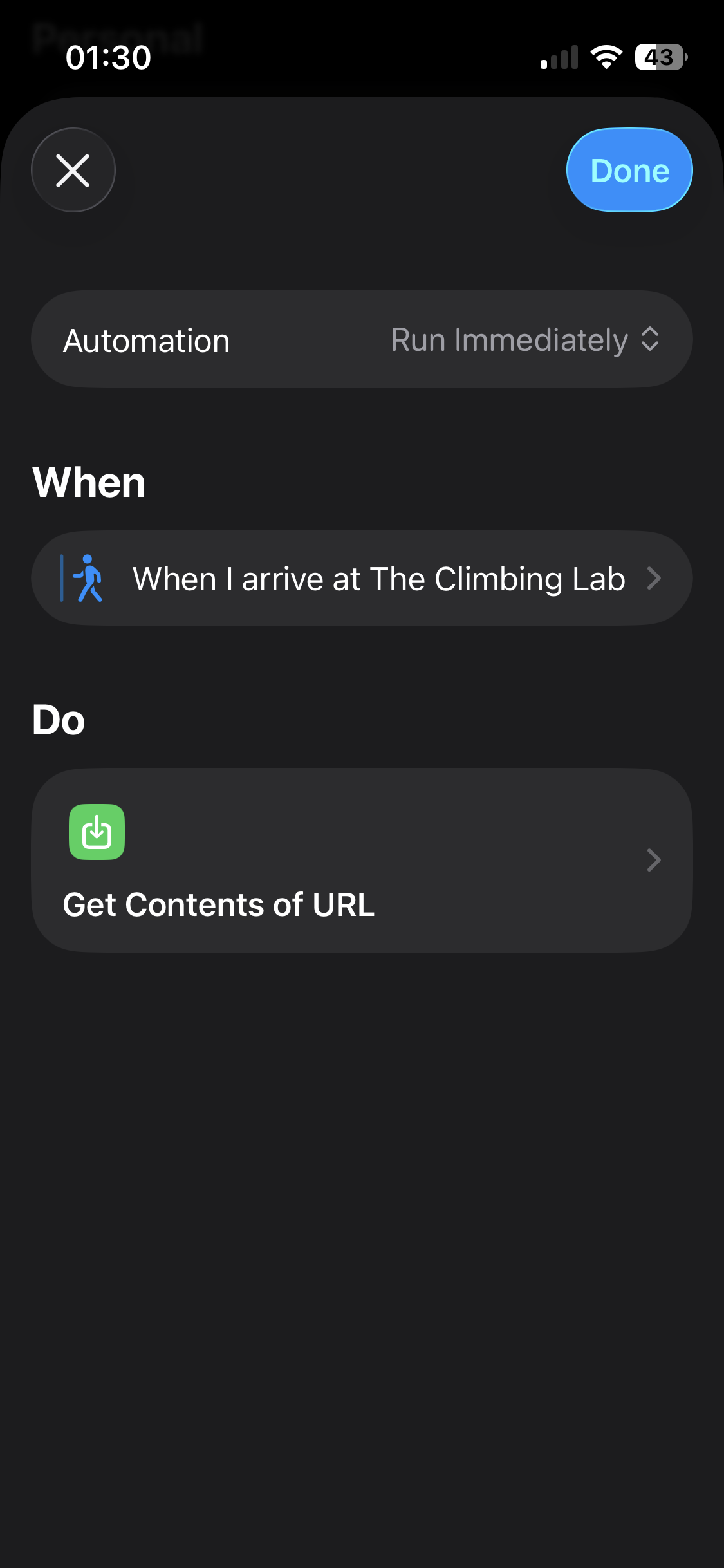 After that, I set up strength training. Again, the WHO recommends 2.5 hours per week, and for me that’s bouldering, since it’s the only strength exercise I enjoy. Tracking it turned out to be even easier than running. Using Apple Shortcuts, my phone sends a POST request with the current time when I arrive within 500 meters of my climbing gym, and another when I leave. That session gets logged automatically. I use the same method for football: when I arrive and leave the pitch, it tracks that as cardio.