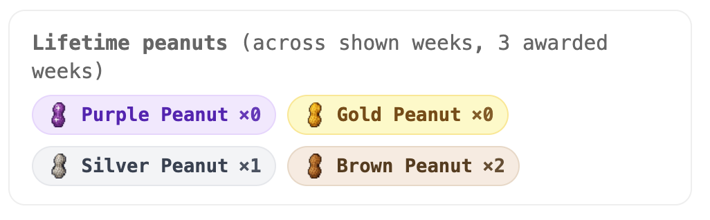 I also added a small “award” system using peanuts. (I chose peanuts because they feel sufficiently minor/insignificant/meaningless).