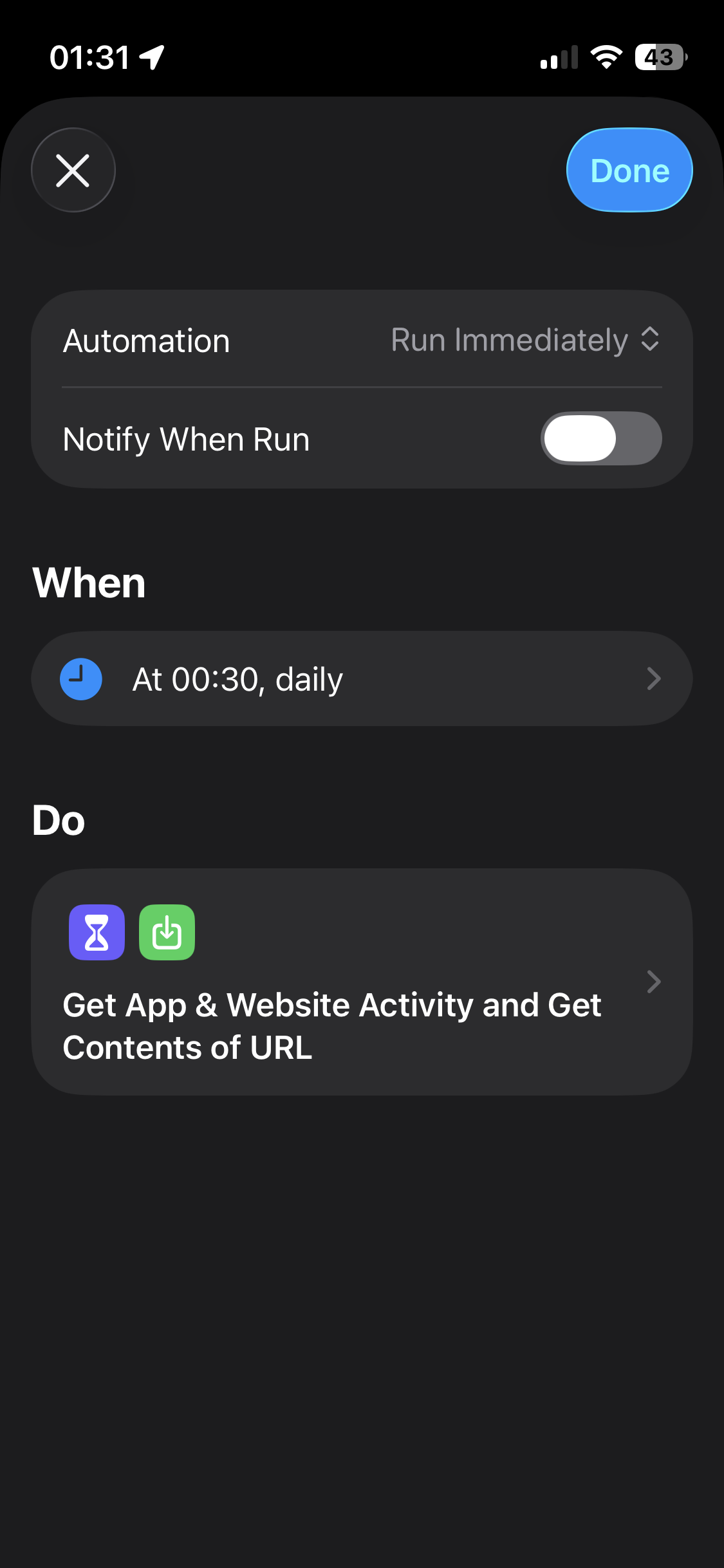 - On iPhone: my first attempt was to treat any browser usage as procrastination, since that’s usually true. The problem was that if I locked my phone without closing Safari or Chrome, the “end” automation never triggered. That meant I’d end up logging hours of fake activity. This wasn’t an issue with Strava because you always have to end a run manually.