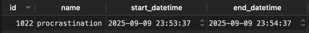 I set up a MySQL database on my server where each row logs a start time, end time, and a label for the habit it’s tracking.